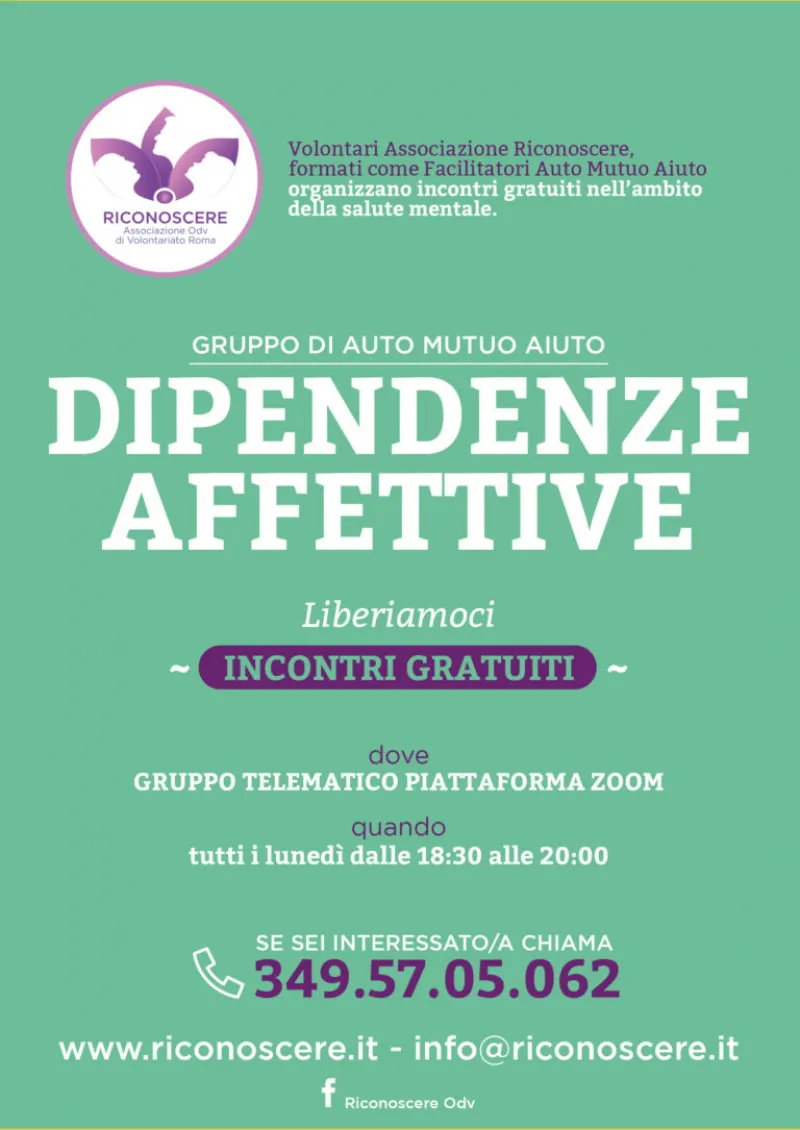 Gruppo Auto Mutuo Aiuto gratuito, il lunedì dalle ore 18:30 alle ore 20, online (zoom) , per persone con problema di dipendenza affettiva. Per partecipare chiama il n +39 3495705062 per un appuntamento conoscitivo