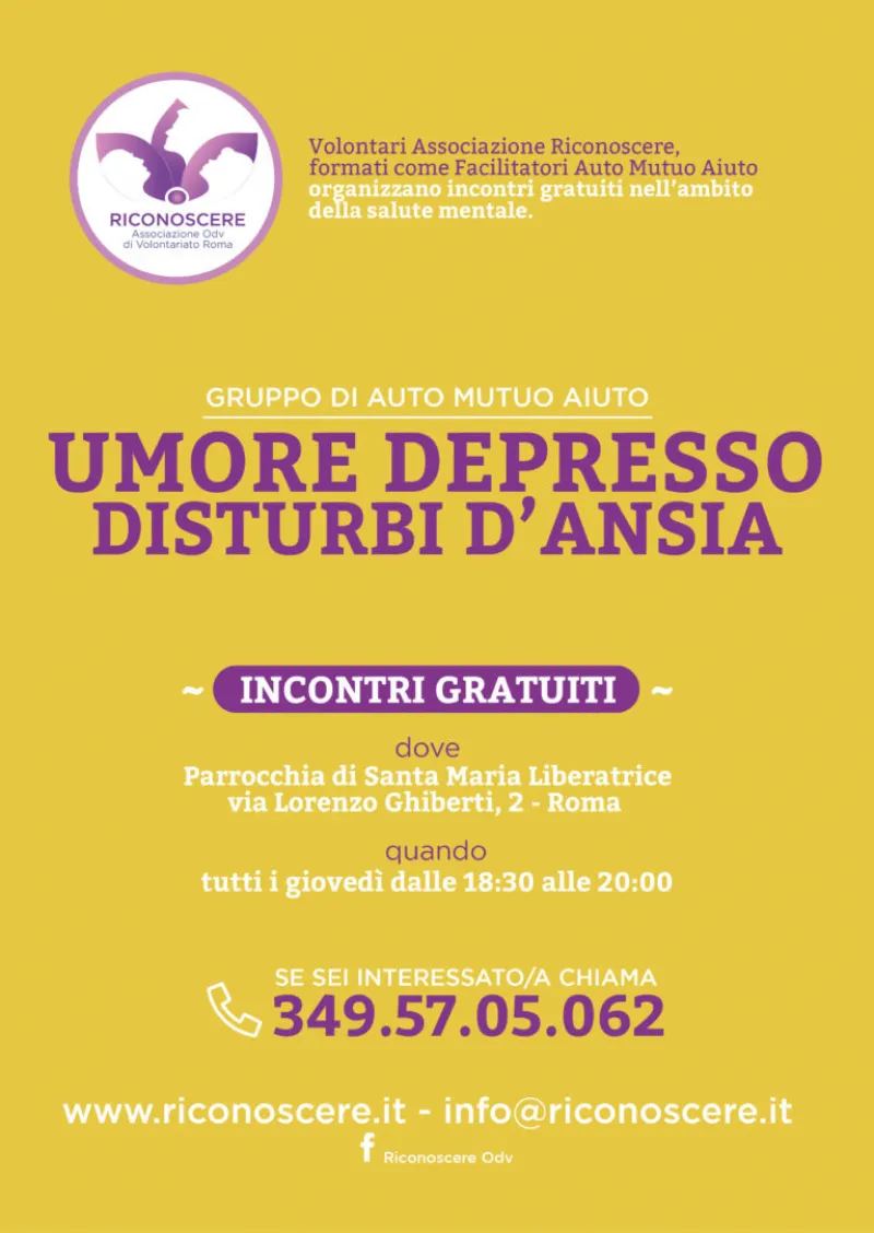 La nostra organizzazione propone un gruppo di auto mutuo aiuto gratuito , momentaneamente chiamato “testaccio” rivolto a coloro che soffrono per disagi legati a stati depressivi e di ansia. Referente patrizia
